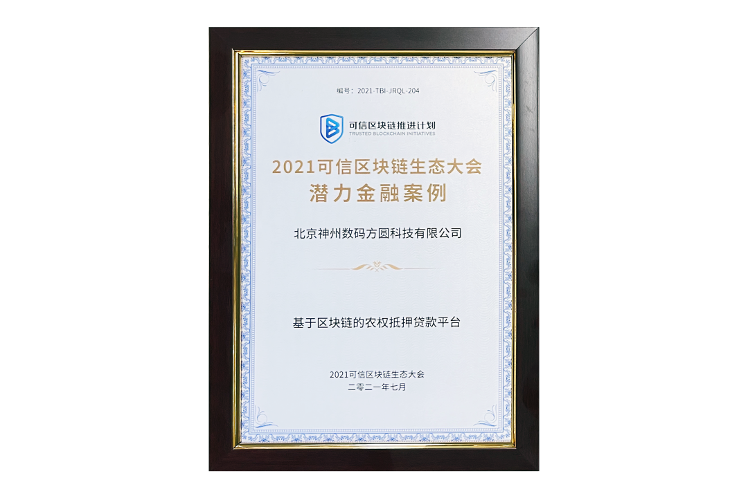 7月13日,由中国信息通信研究院、可信区块链推进计划主办的“2021可信区块链生态大会”在京举办,并隆重发布系列成果。神州信息子公司北京米兰电竞方圆科技有限公司(简称:神州方圆)推荐的“基于区块链的农权抵押贷款平台”荣获十大金融应用高潜力案例,为“区块链+农业”落地带来示范效应。